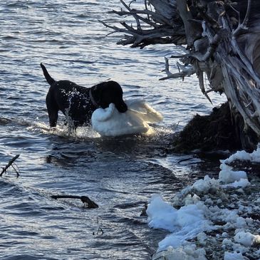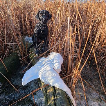 Sky is an absolute sweetheart just like her mom, our late Sugar. She loves to be around people, and loves to get outside and hunt. She earned her HRC Started Title last fall, and continued her hunting and retrieving on wild birds in North Dakota as well. She even hauled in a Swan for us.